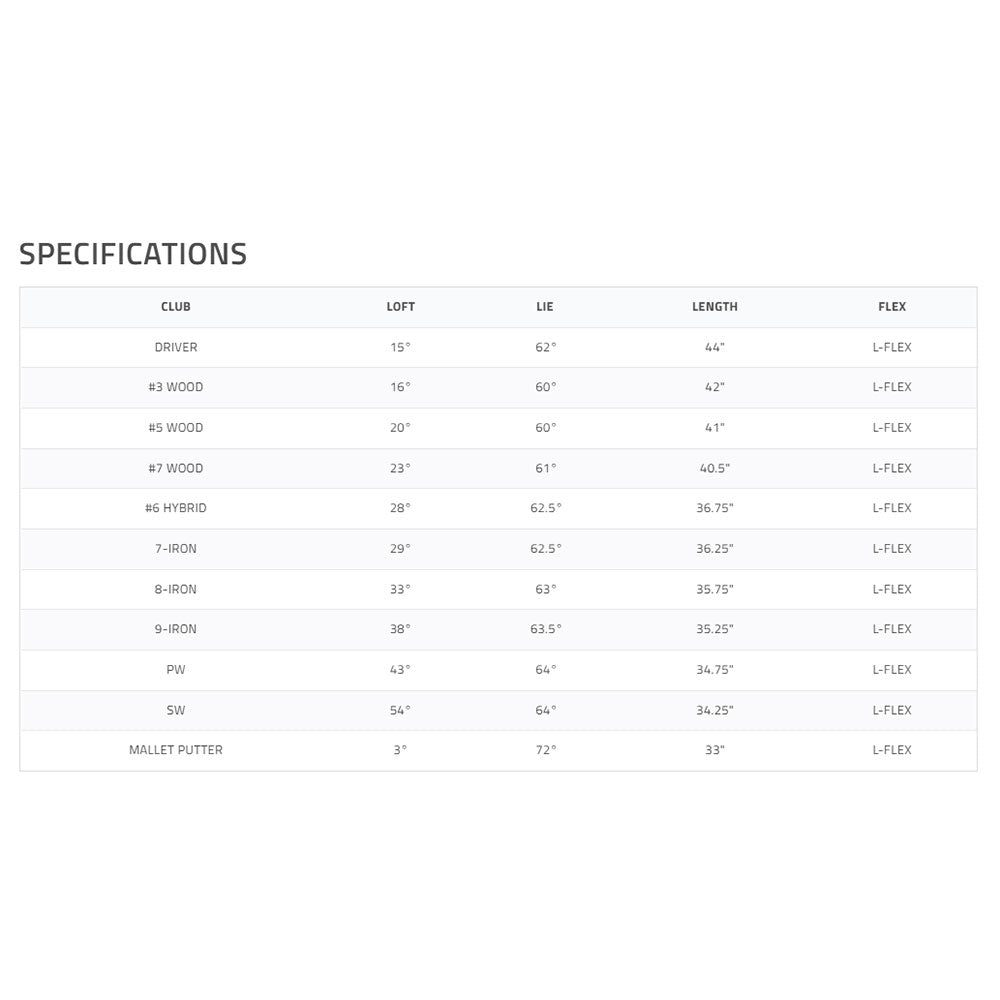 The Tour Edge TE-400 Womens Complete Golf Set brings together performance, style, and forgiveness in one ready-to-play package. Designed for right-handed golfers, this set includes a high-launch driver, easy-to-hit fairway woods, a versatile hybrid, and forgiving stainless-steel irons that inspire confidence with every swing. The lightweight graphite shafts are perfectly tuned for women's swing speeds, helping maximize distance and control. A soft-feel mallet putter and a sleek, lightweight cart bag round out the set. It is the perfect blend of power, precision, and playability for women looking to elevate their game.