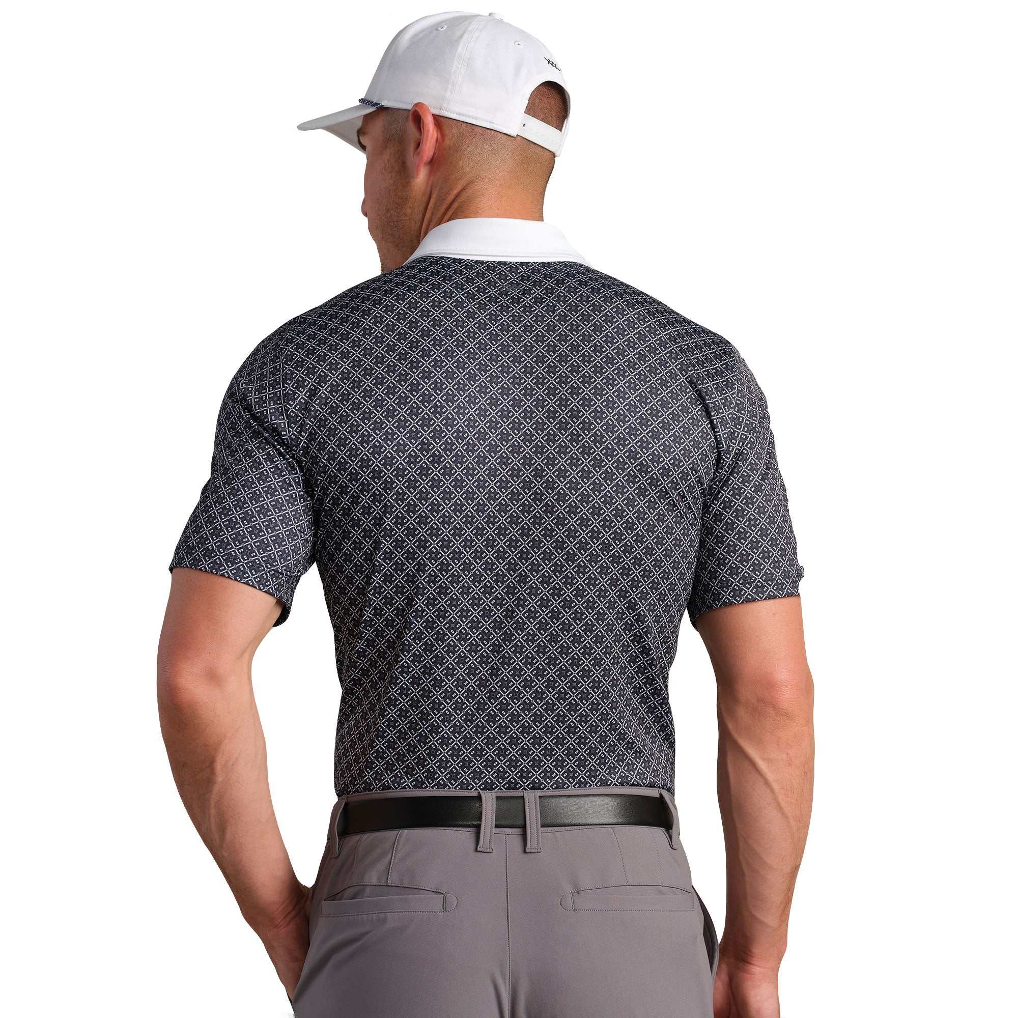 The Rhone Sport Geo Men's Golf Polo brings bold style and functional performance together in a modern, eye-catching design. Featuring a geo-print mesh-lined collar, moisture-wicking stretch fabric, side slits for enhanced mobility, and UPF 50+ sun protection, this polo is built to handle extended rounds in comfort. Treated with Rhone's GOLDFUSION - technology, it stays fresh through multiple wears without losing its crisp look. Whether you're teeing off or walking the fairways, it's a stylish pick that moves with you and stands up to the sun and sweat.