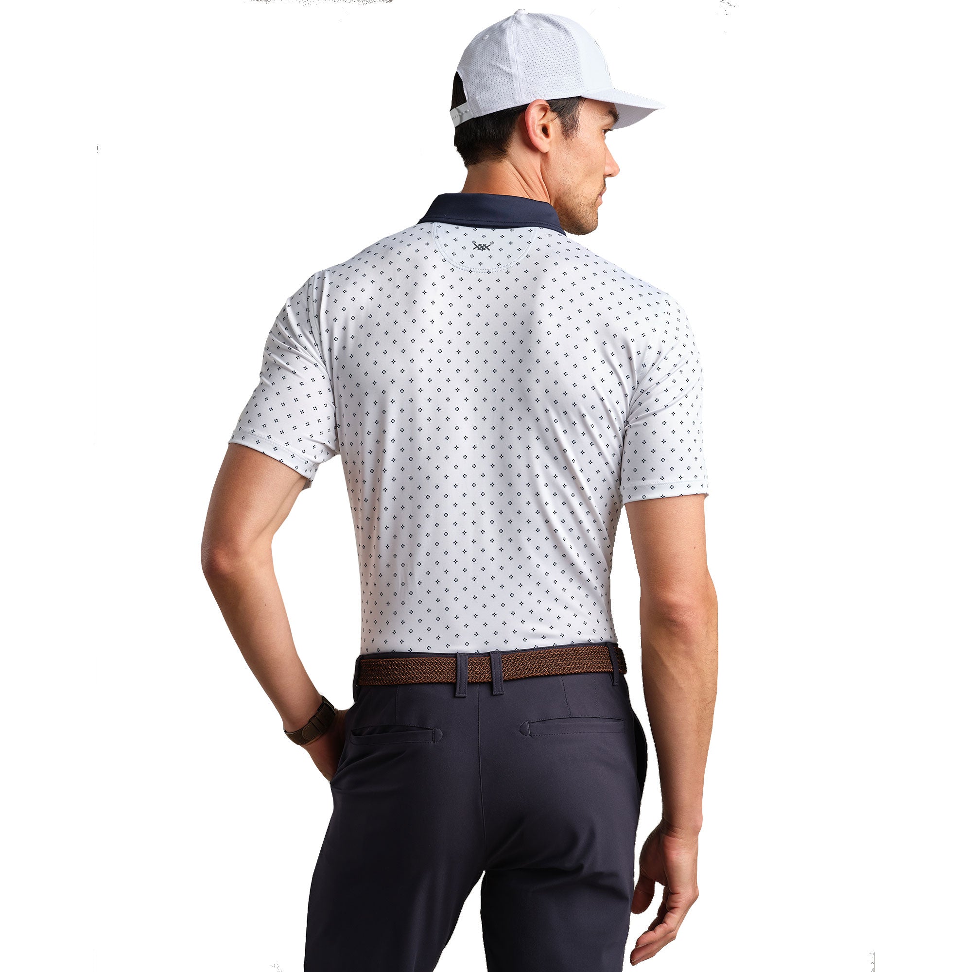 The Rhone Sport Micro Foulard Men's Golf Polo brings a refined touch to your game with its subtle geometric pattern and modern athletic fit. Crafted from a breathable polyester-spandex blend, it offers four-way stretch and moisture-wicking properties to keep you comfortable during every swing. The interior mesh-lined collar and under-collar buttons provide added structure and breathability, while UPF 50+ sun protection and GOLDFUSION - technology ensure you stay fresh and protected.