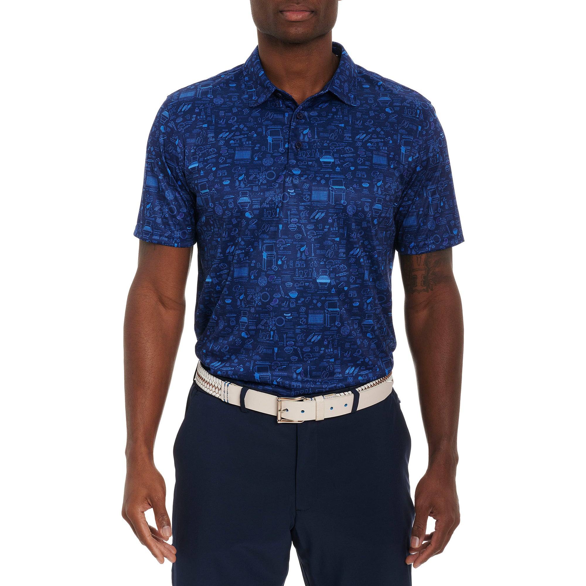 Show off your love of the BBQ with the Robert Graham BBQ Boss Performance Knit Golf Polo. The BBQ Boss polo is built with a performance stretch material that is moisture wicking, breathable and comes with UV protection that will keep golfers dry and comfortable throughout the round and protected from the harmful UV rays of the sun. The mid-century BBQ pattern and logo engraved buttons will provide a touch of style that will have you looking good on and off the golf course. This polo pairs well with shorts or pants and will also look great with a tailored Robert Graham sport coat.