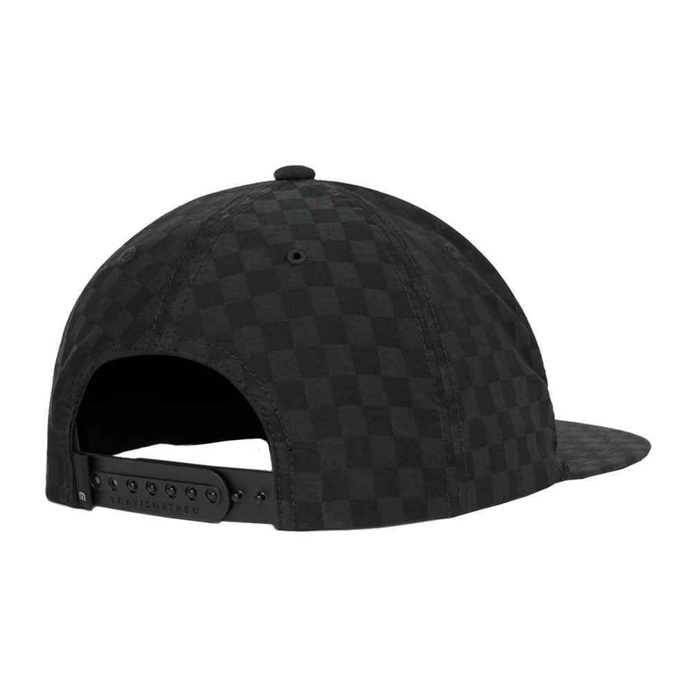The TravisMathew Time of Arrival Men's Golf Hat combines retro flair with modern functionality. Featuring an all-over checkered print and a signature golf cart silicone patch with rope detail, this hat adds a stylish touch to your golf ensemble. The adjustable snapback closure ensures a customizable fit, making it perfect for both on and off the course.
